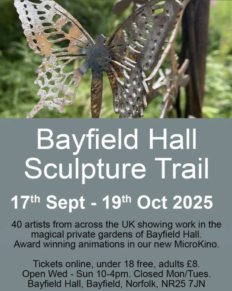 The fourth Bayfield Hall Sculpture Trail features contemporary artists, sculptors, musicians and makers in the beautiful gardens and grounds of Bayfield Hall near Holt. The trail is curated by Sarah Cannell with kind permission to use the private gardens and chapel by Caroline and Roger Combe. An uplifting, inspiring natural space for people to experience contemporary art in a beautiful rural setting in North Norfolk.