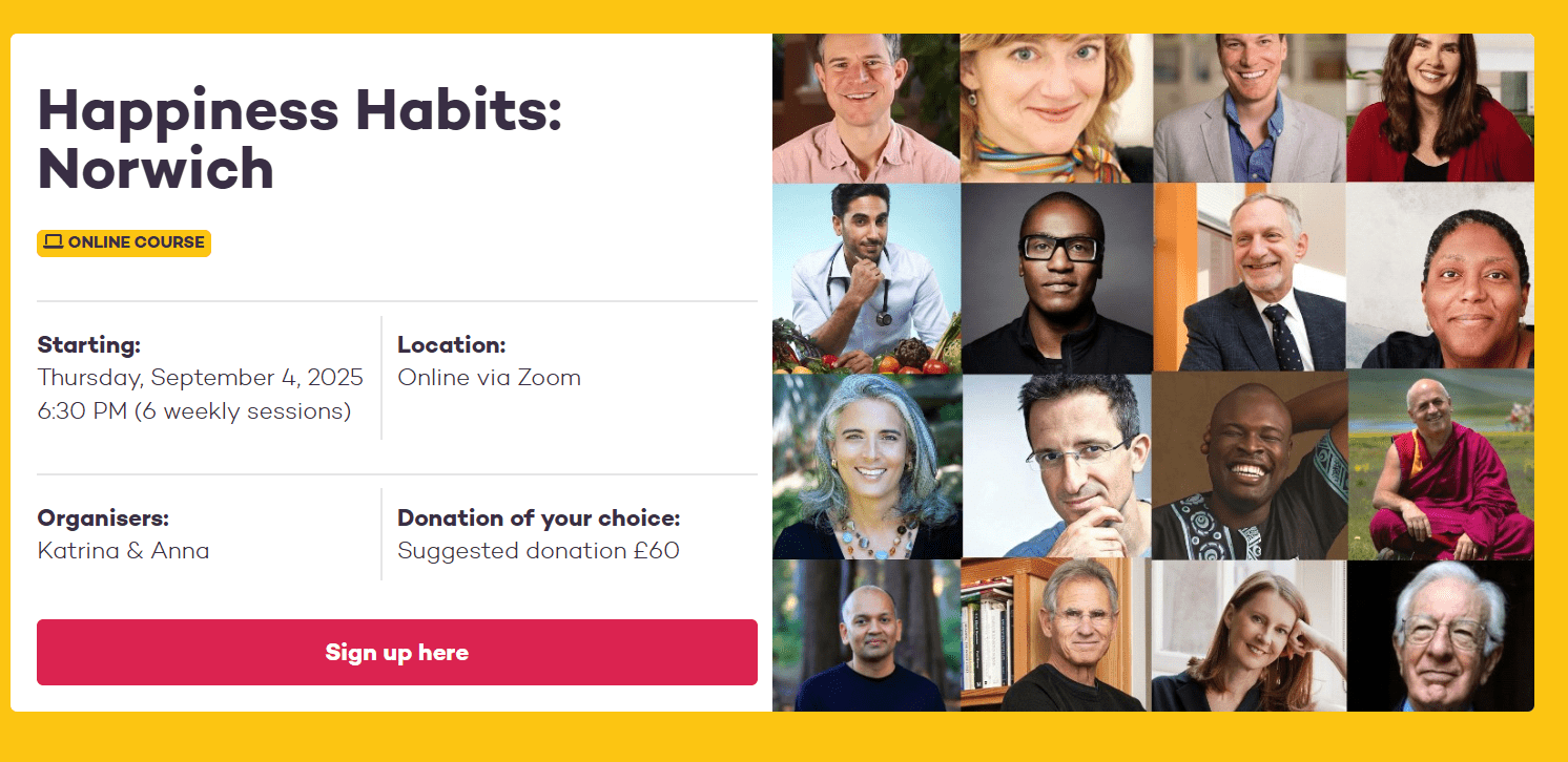 This 6-week course has been developed by the charity Action for Happiness, drawing on the wisdom of experts across many fields to cover the practical habits of living a happier life and spreading happiness to others.