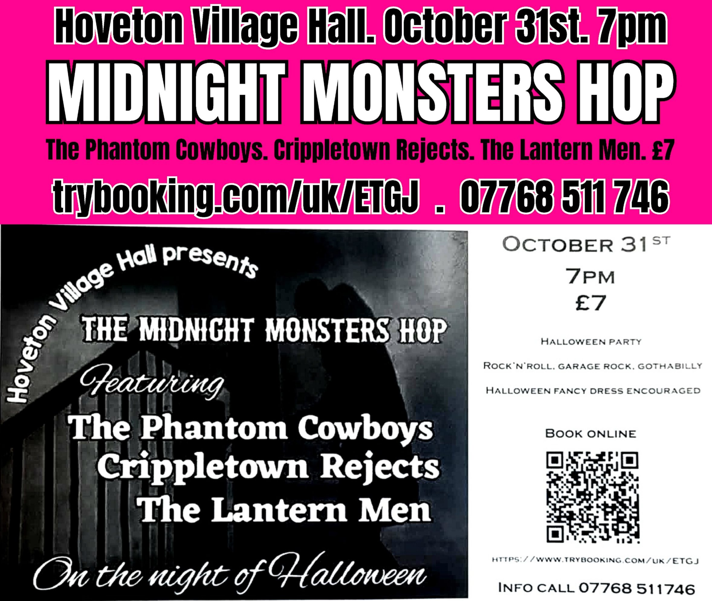 The world renowned PHANTOM COWBOYS headline a rockin’ Halloween party with support from guest bands – the upcoming CRIPPLETOWN REJECTS see this show while they’re still playing small gigs. Plus a rare chance to see Broads boppers THE LANTERN MEN reappear for the event. All this on the night of Halloween at Hoveton Village Hall. Under 14’s allowed with a responsible adult. Mighty Fine Bar will be open. Halloween fancy dress encouraged.