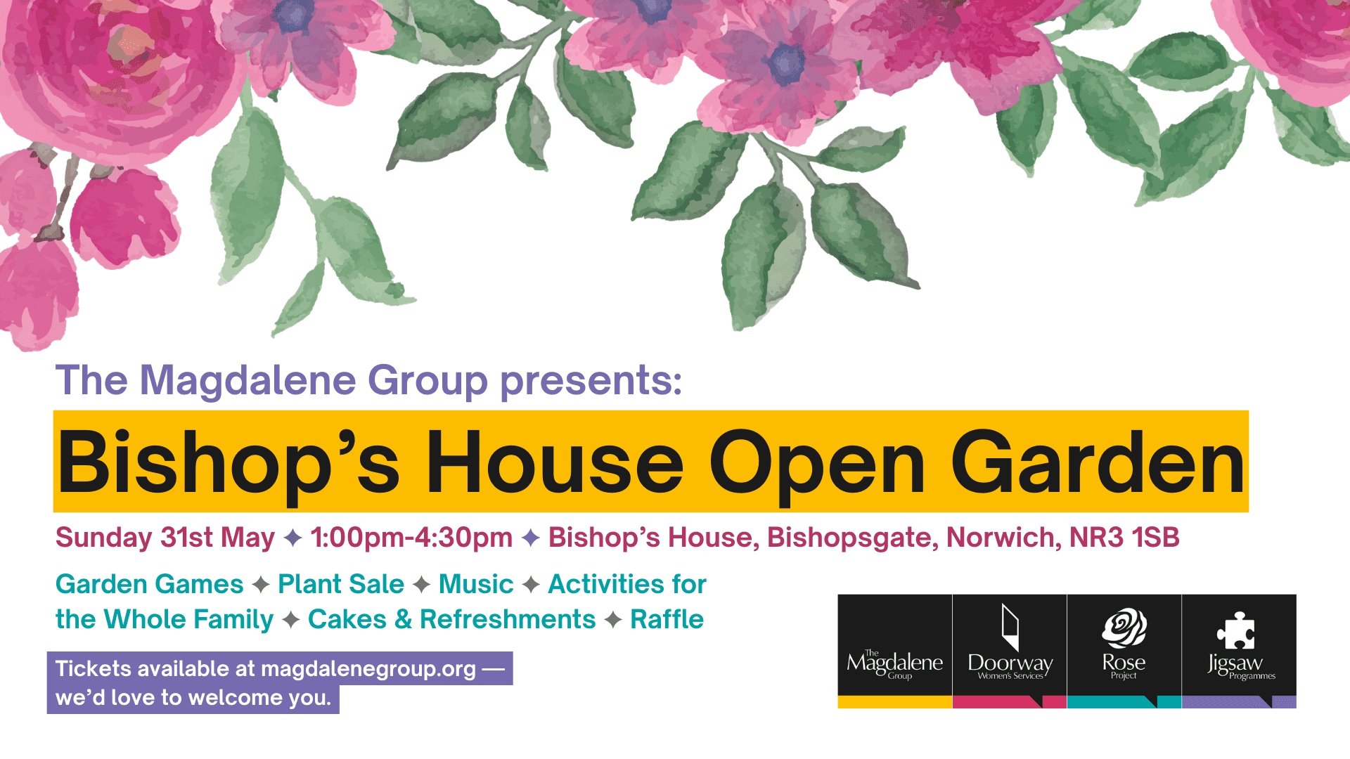 The Magdalene Group is delighted to welcome you to a special open‑garden event on Sunday 31 May, 1:00pm-4:30pm, at the historic Bishop’s House, by kind permission of the Bishop of Norwich, The Rt Revd Graham Usher, and Mrs Rachel Usher. This rare opportunity invites visitors to discover one of Norwich’s most enchanting private gardens while helping to support The Magdalene Group’s vital work with women and young people on violence against women and girls (VAWG) who are affected by abuse, violence, coercion and exploitation.
