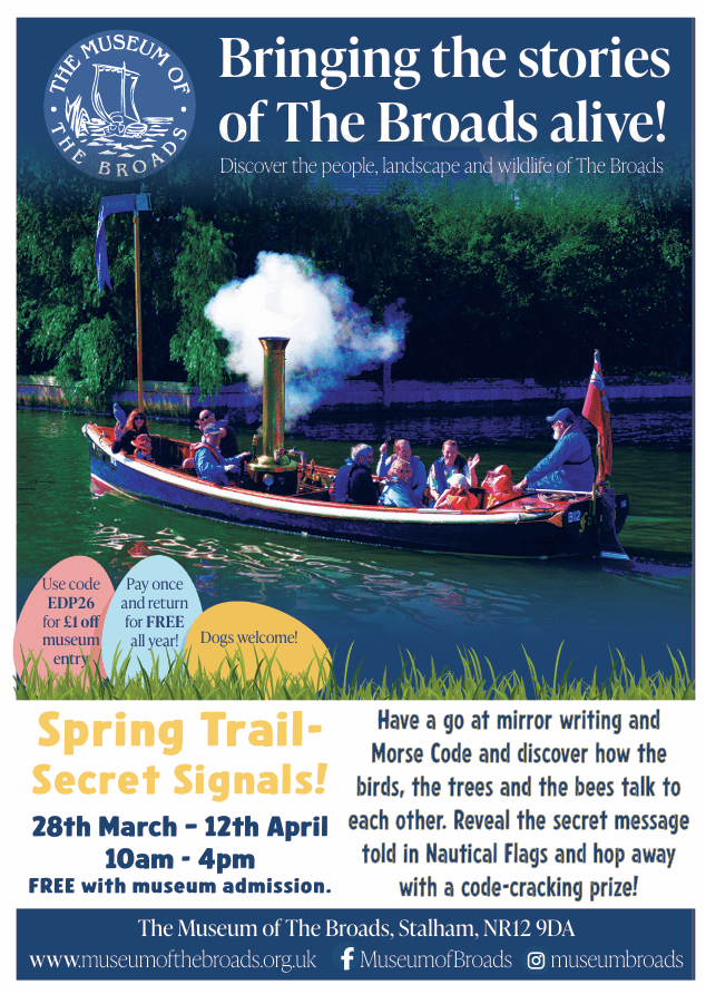 Spring Trail - Secret Signals! at the Museum of the Broads In this family-friendly trail, explore the museum to discover 12 hidden messages. Have a go at mirror writing and morse code and discover how the birds, the trees and the bees talk to each other. Find the pink sound Pod, discover the Prize Password […]