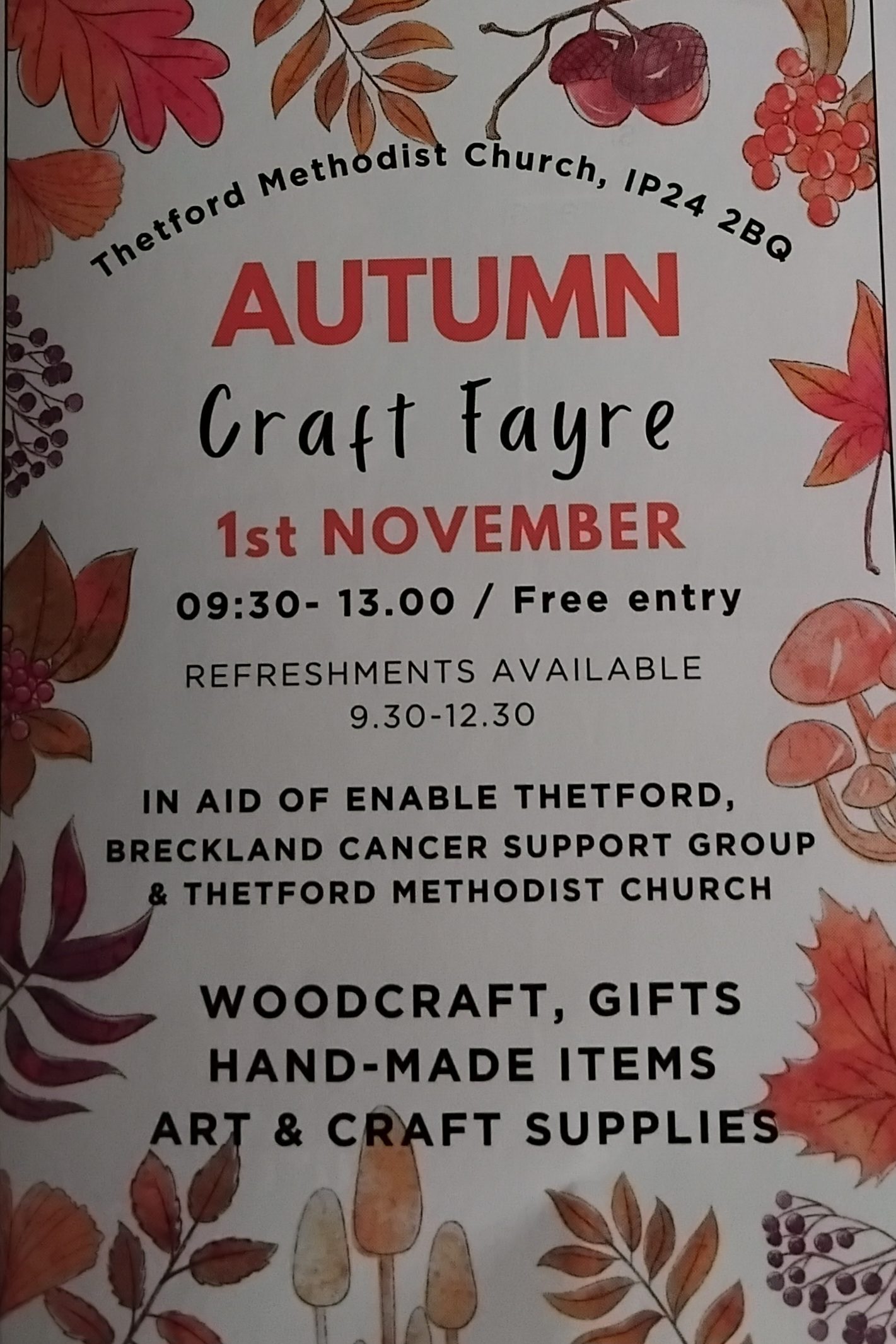 I.A.O Enable Thetfkrd Breckland Cancer Support Group & Thetford Methodist Church Woodcraft,gifts,hand-made items art and craft supplies Refreshments avaliable 9.30-12.30