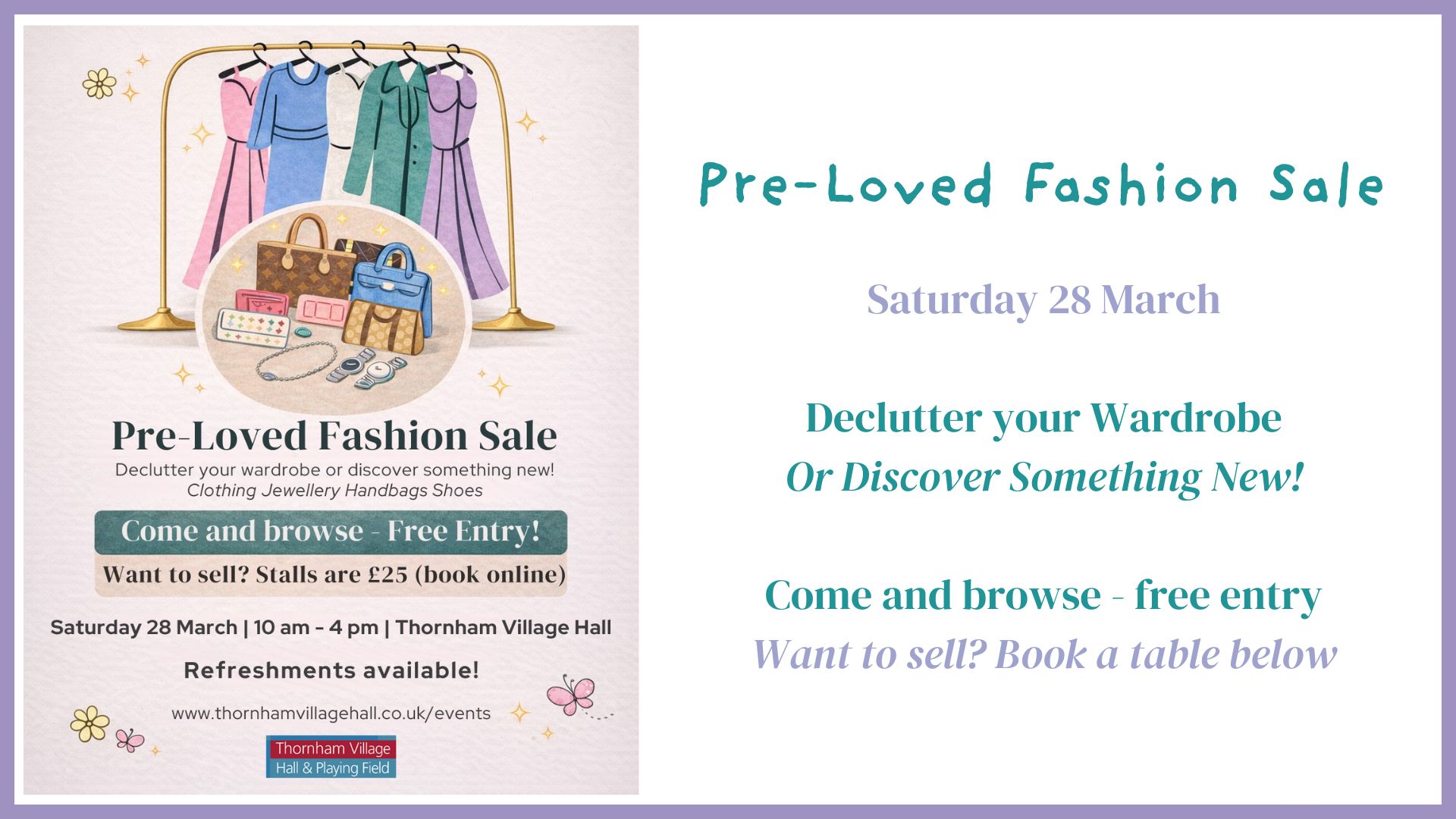 👗✨ Pre-Loved Fashion Sale ✨👗 Want to sell? Clear out your wardrobe and make some money! 🪑 Tables £25 (booking essential) 👚 Clothes, shoes, bags, jewellery & accessories 💷 Keep what you make 🛍️ Free entry to browse & buy ☕ Refreshments available