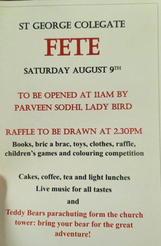 Summer Fete, stalls in church include Cakes, books, bric a brac, refreshments, music , children’s games, and raffle. Teddy bear parachute jump from top of the church tower.