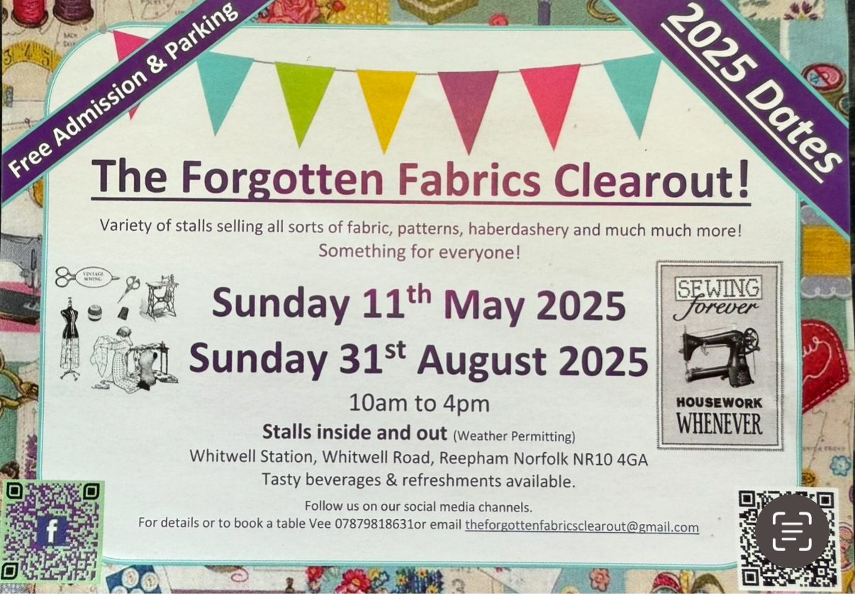 Variety of stalls selling all sorts of fabric, patterns, haberdashery and much much more! Something for everyone! Tasty beverages & refreshments available. Follow us on our social media channels. For details or to book a table contact Vee on 07879818631or email theforgottenfabricsclearout@gmail.com